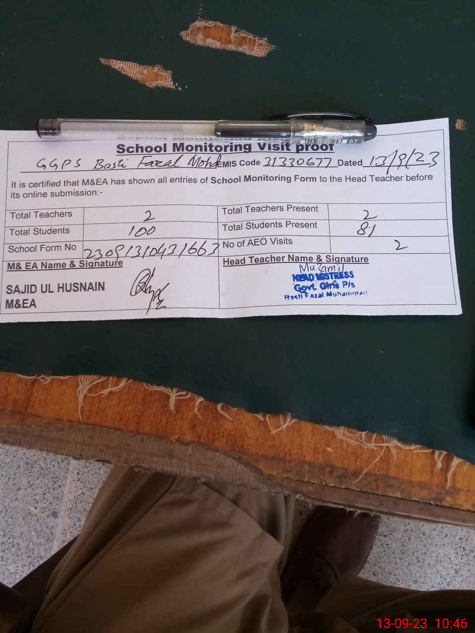 | Attendance Register | Head Teacher | MEA with School | Visit Proof |