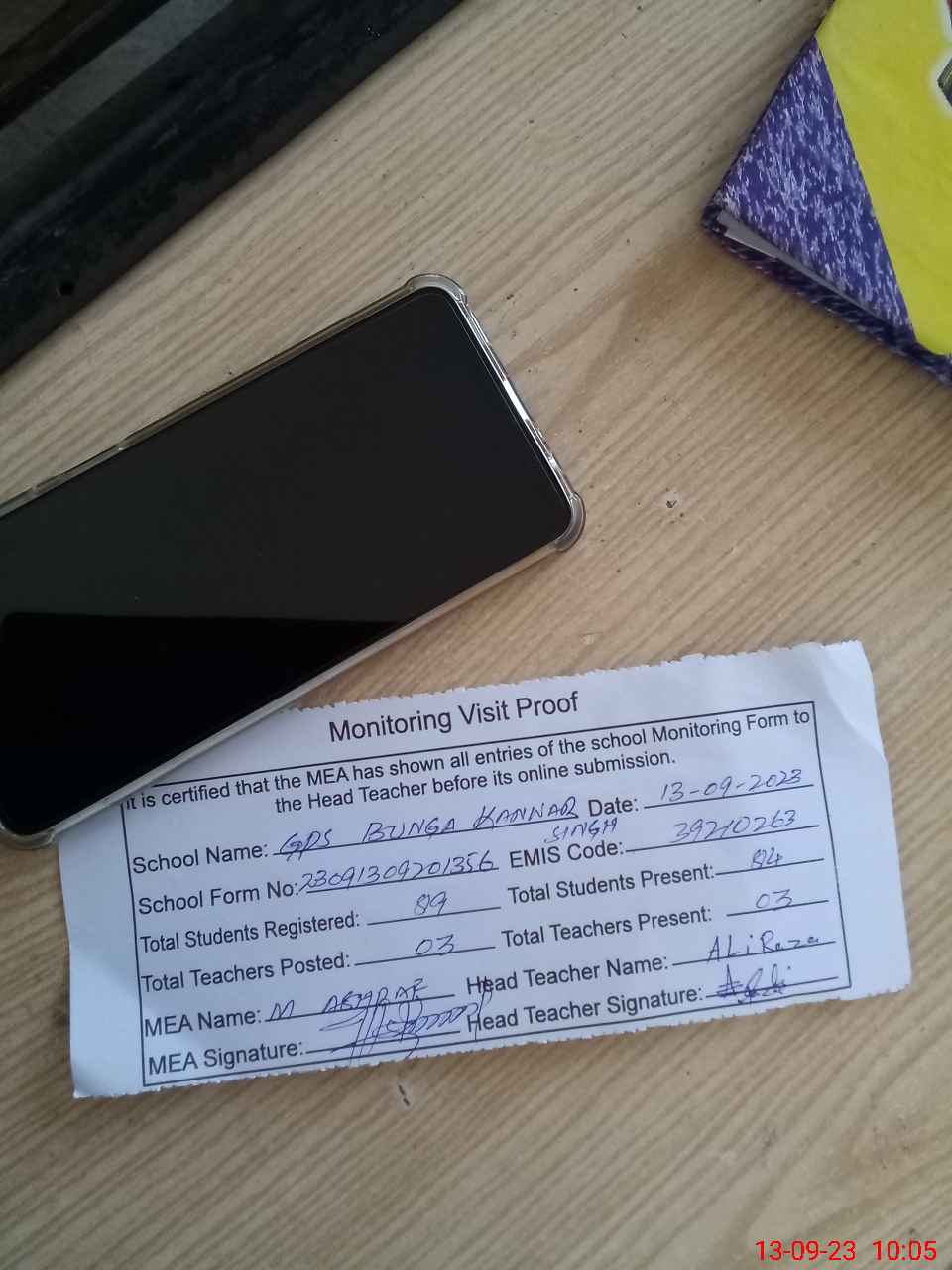 | Attendance Register | Head Teacher | MEA with School | Visit Proof |