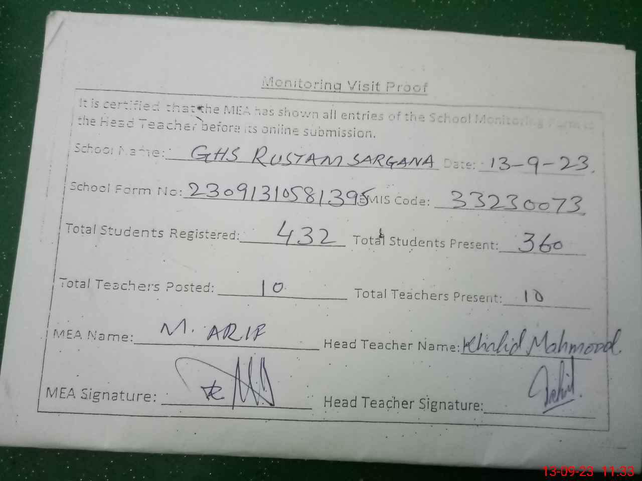 | EMIS Code: 33230073 | Name of School: GHS RUSTAM SARGANA | |||