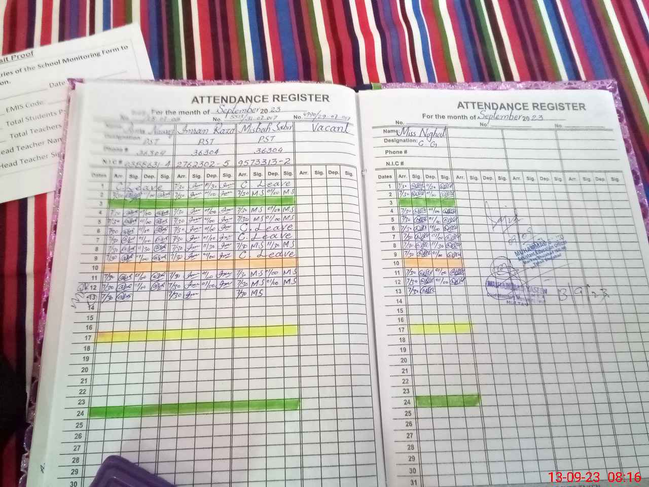 | CNIC | Full Name | Designation | R/C | Absence During Last Calender Month |