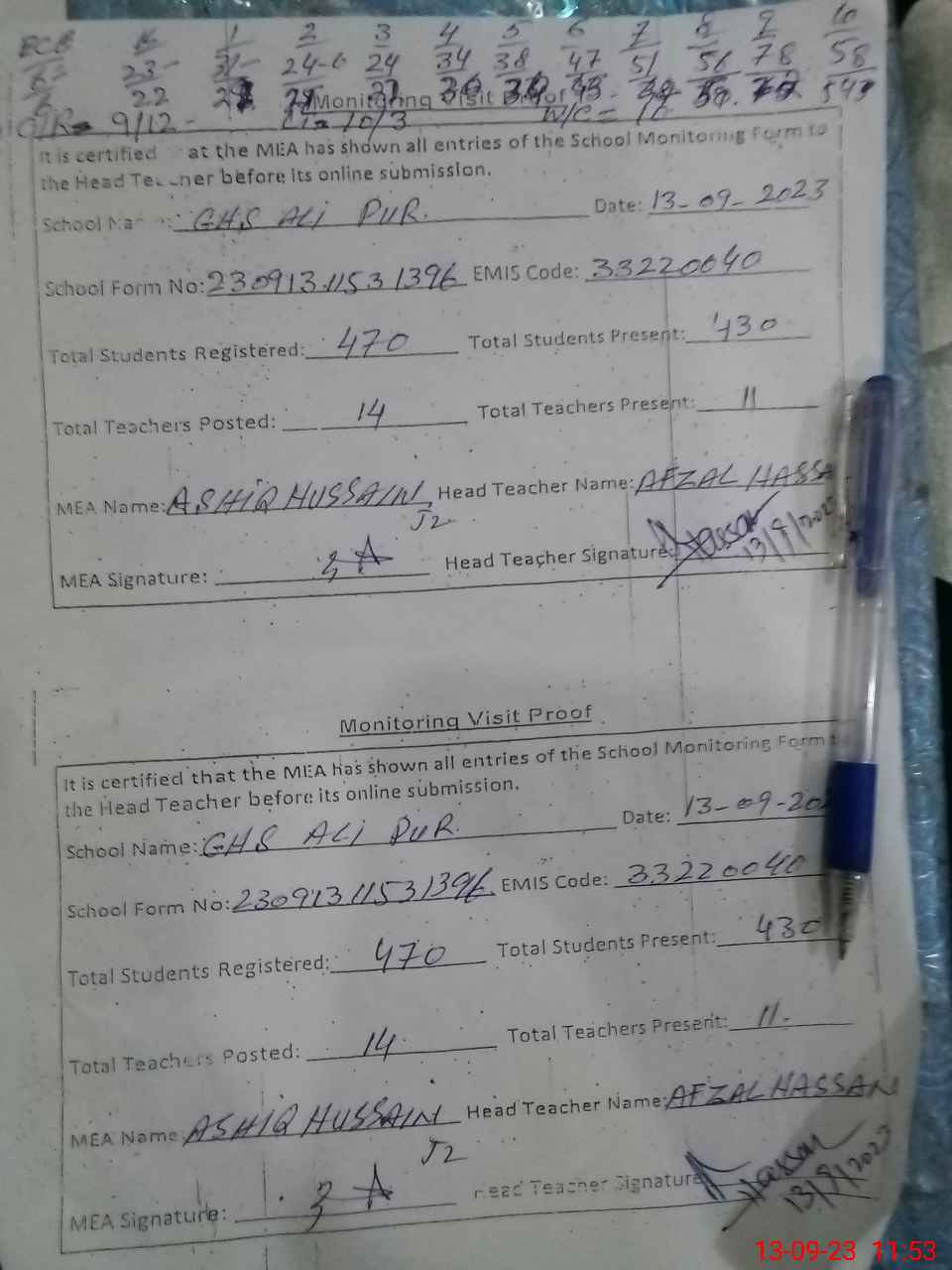 | EMIS Code: 33220040 | Name of School: GHS ALI PUR | |||