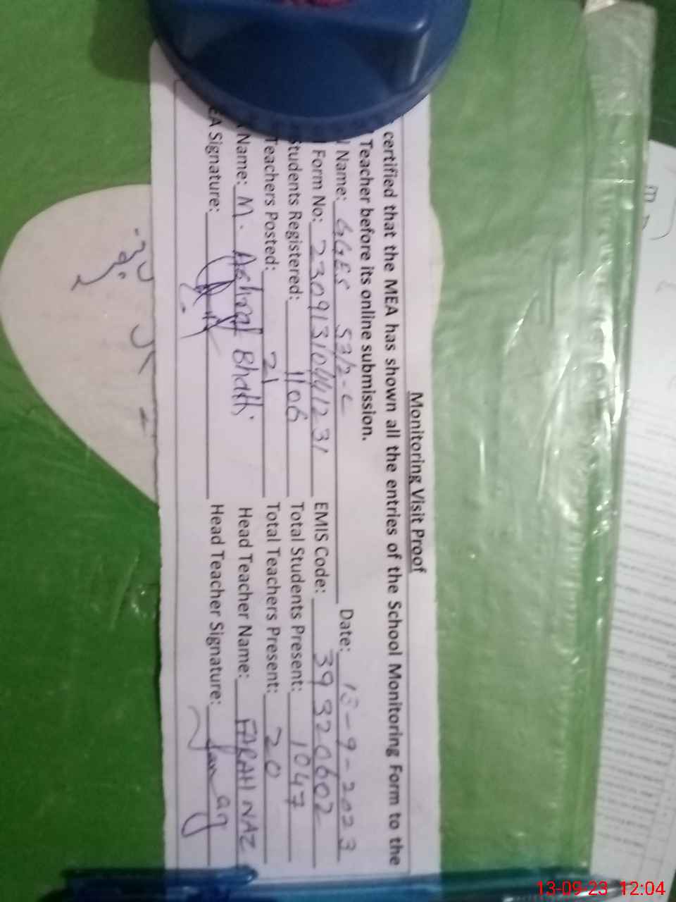 | Attendance Register | Head Teacher | MEA with School | Visit Proof |