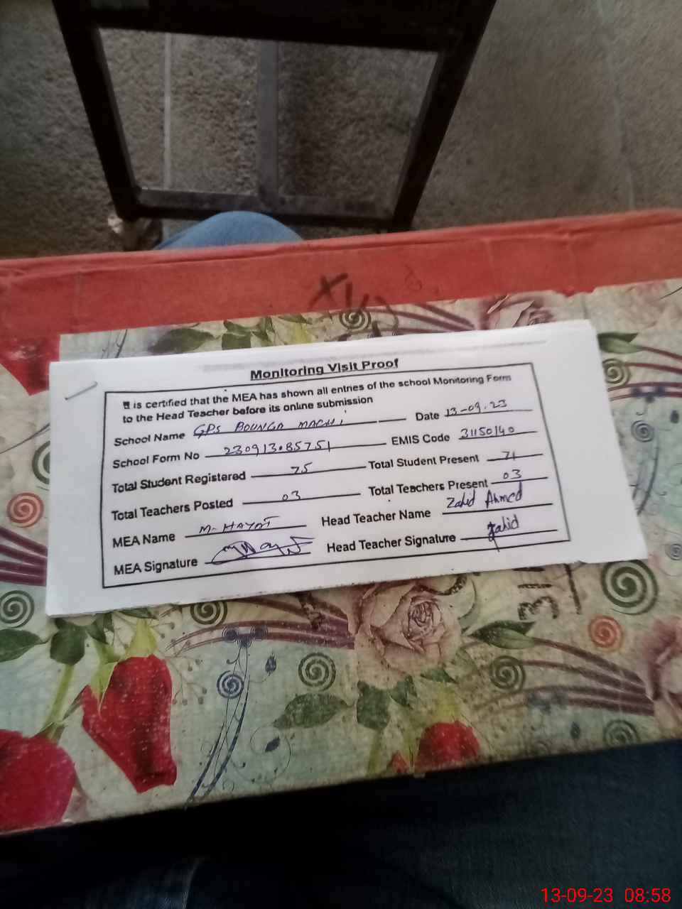 | Attendance Register | Head Teacher | MEA with School | Visit Proof |