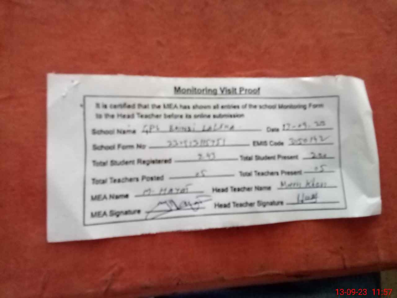 | Attendance Register | Head Teacher | MEA with School | Visit Proof |