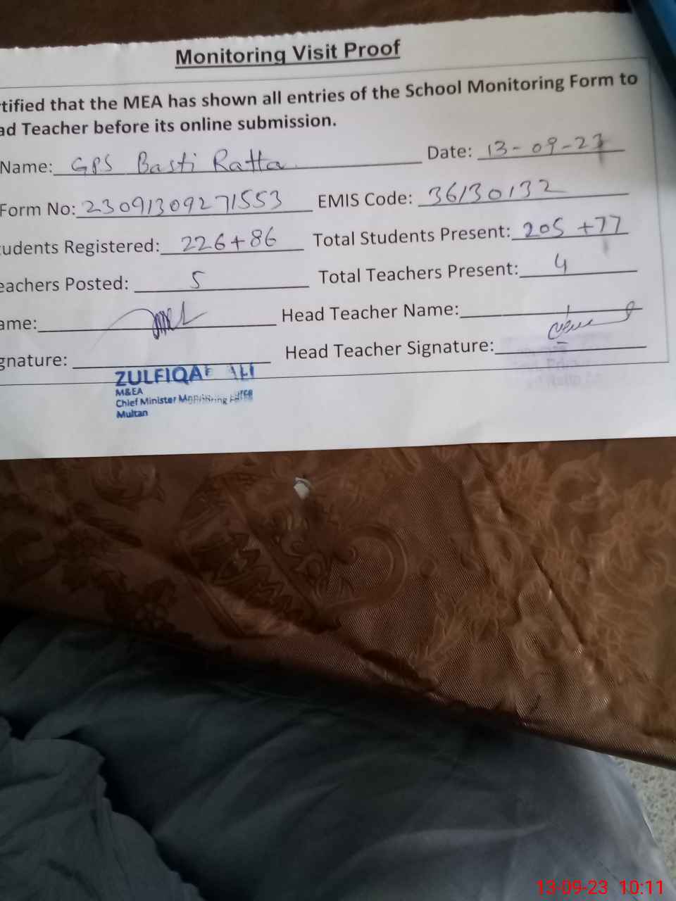 | Name: MU**** JA**** Designation: (School Headmaster's/Headmistress's) HEAD MASTER Phone/Cell Number: 03**** |