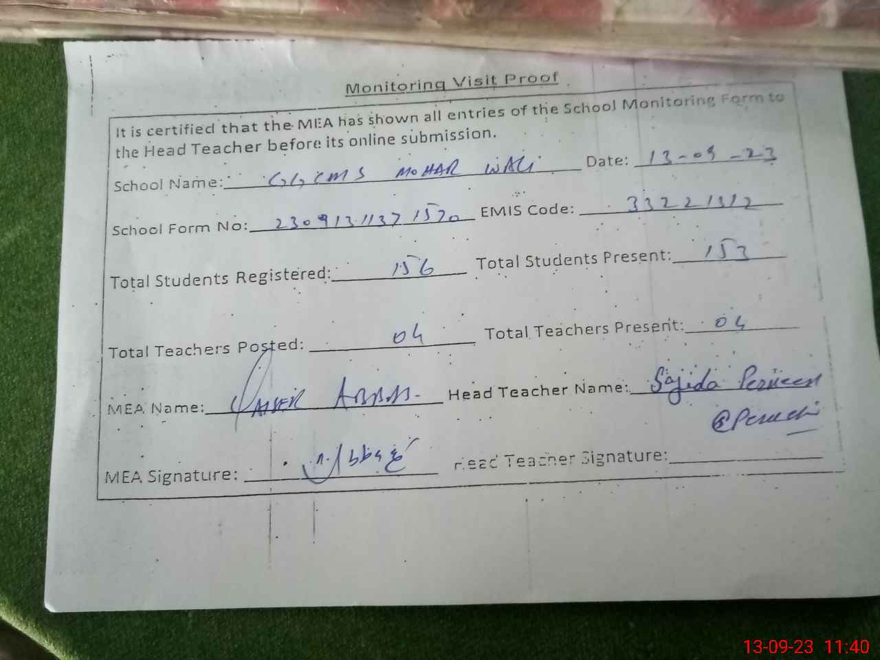 | Attendance Register | Head Teacher | MEA with School | Visit Proof |