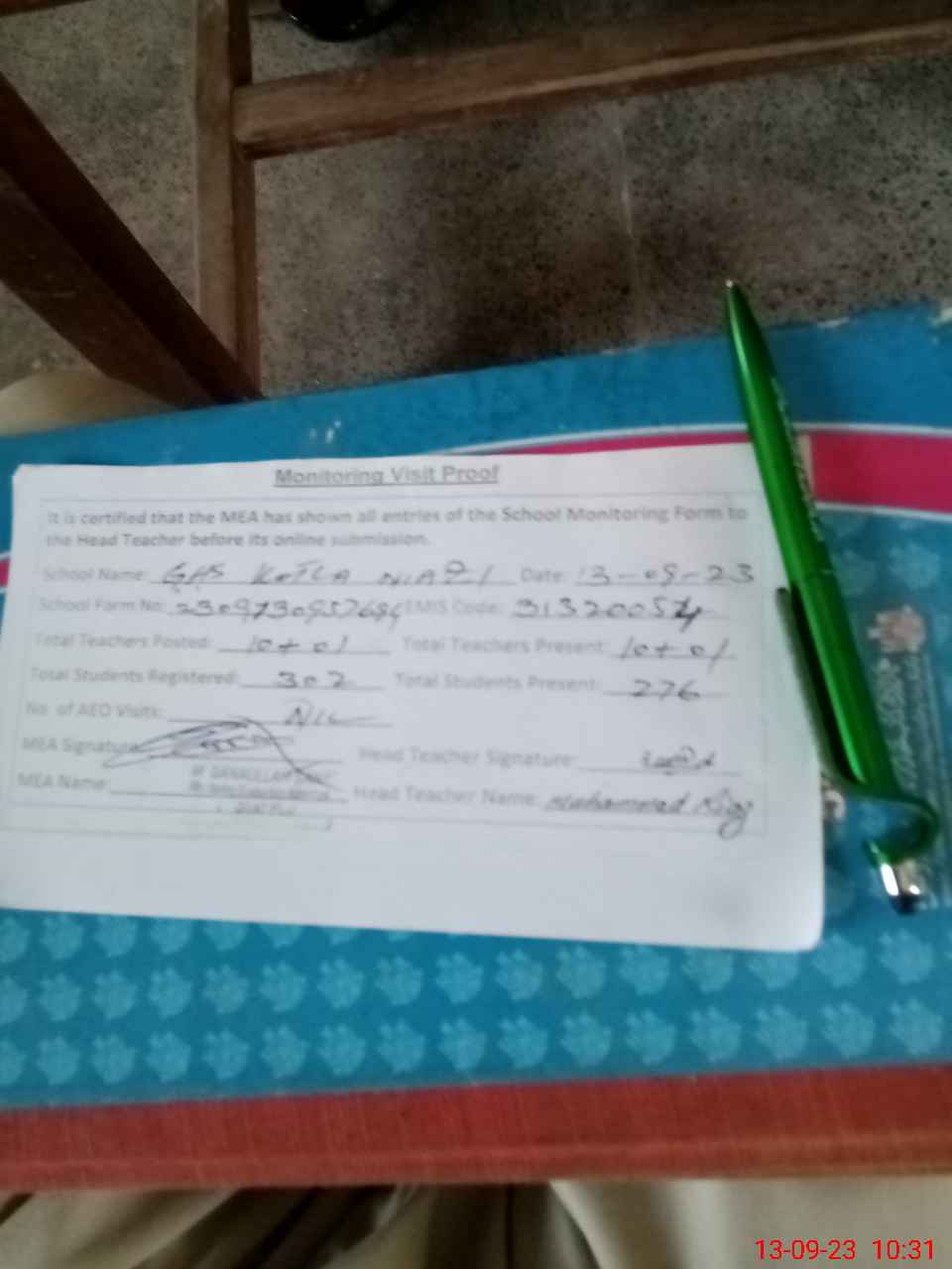 | Attendance Register | Head Teacher | MEA with School | Visit Proof |