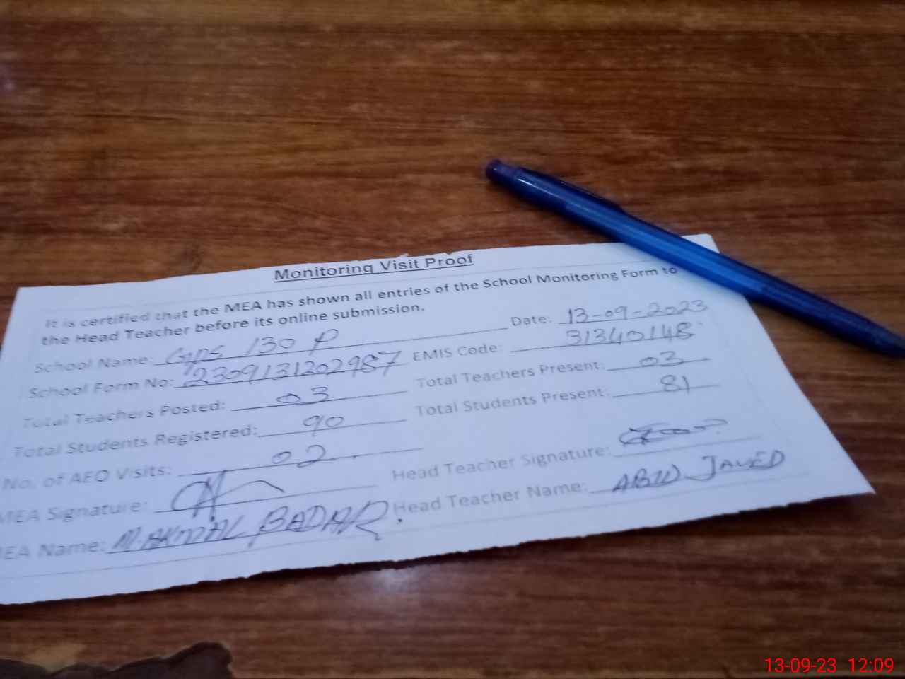 | Attendance Register | Head Teacher | MEA with School | Visit Proof |