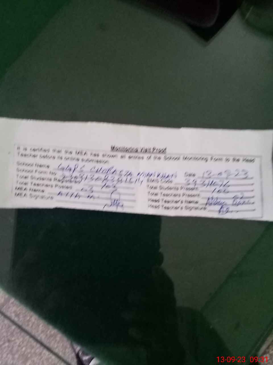 | Attendance Register | Head Teacher | MEA with School | Visit Proof |