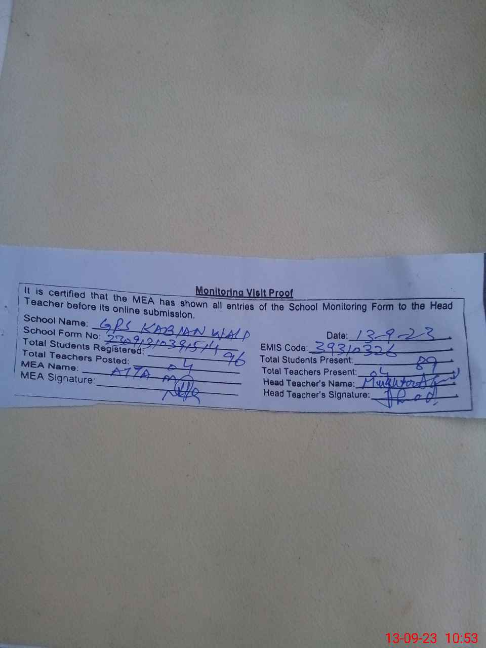 | Attendance Register | Head Teacher | MEA with School | Visit Proof |