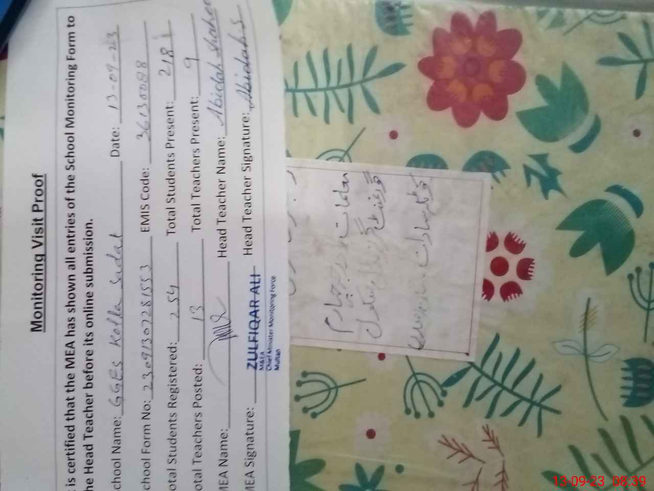 | EMIS Code: 36130088 | Name of School: GGES KOTLA SADAT NEAR SADIQ ABAD MULTAN | |||