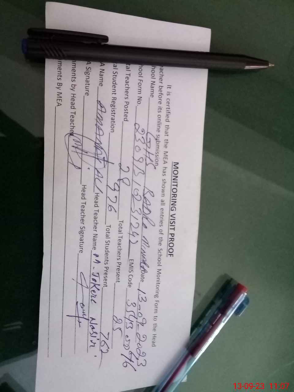 | Attendance Register | Head Teacher | MEA with School | Visit Proof |