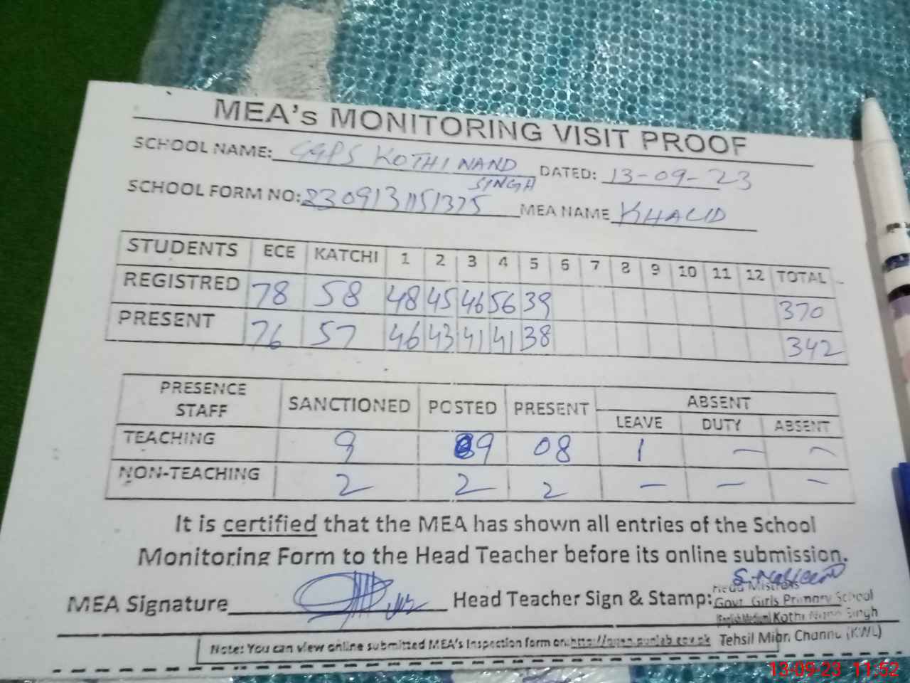 | Attendance Register | Head Teacher | MEA with School | Visit Proof |