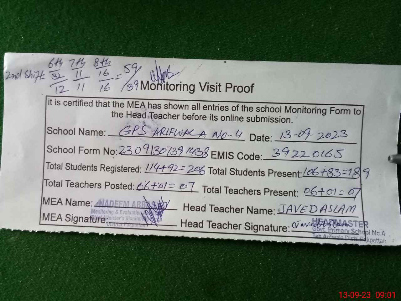 | EMIS Code: 39220165 | Name of School: GPS ARIF WALA NO 4 | |||