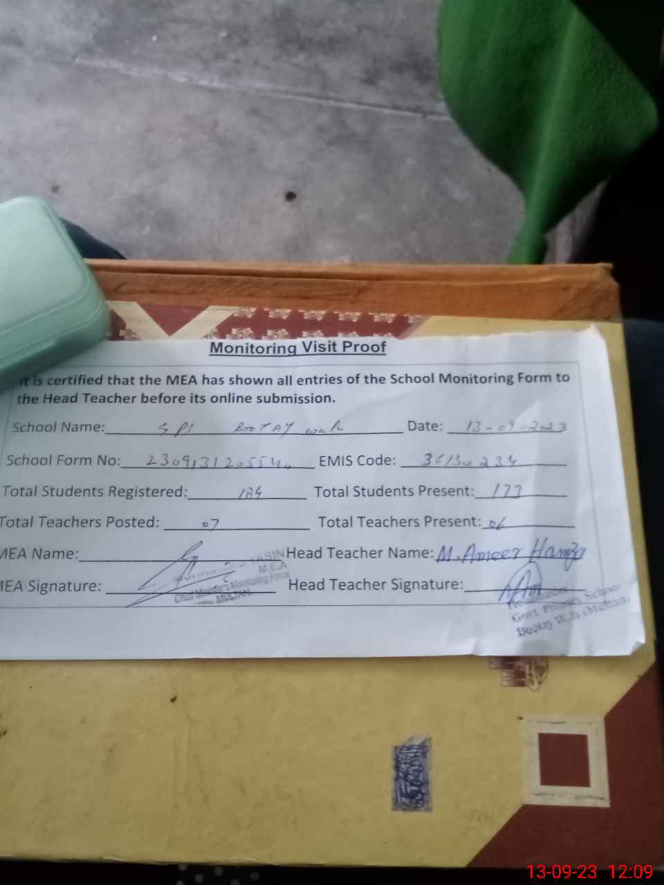 | Attendance Register | Head Teacher | MEA with School | Visit Proof |