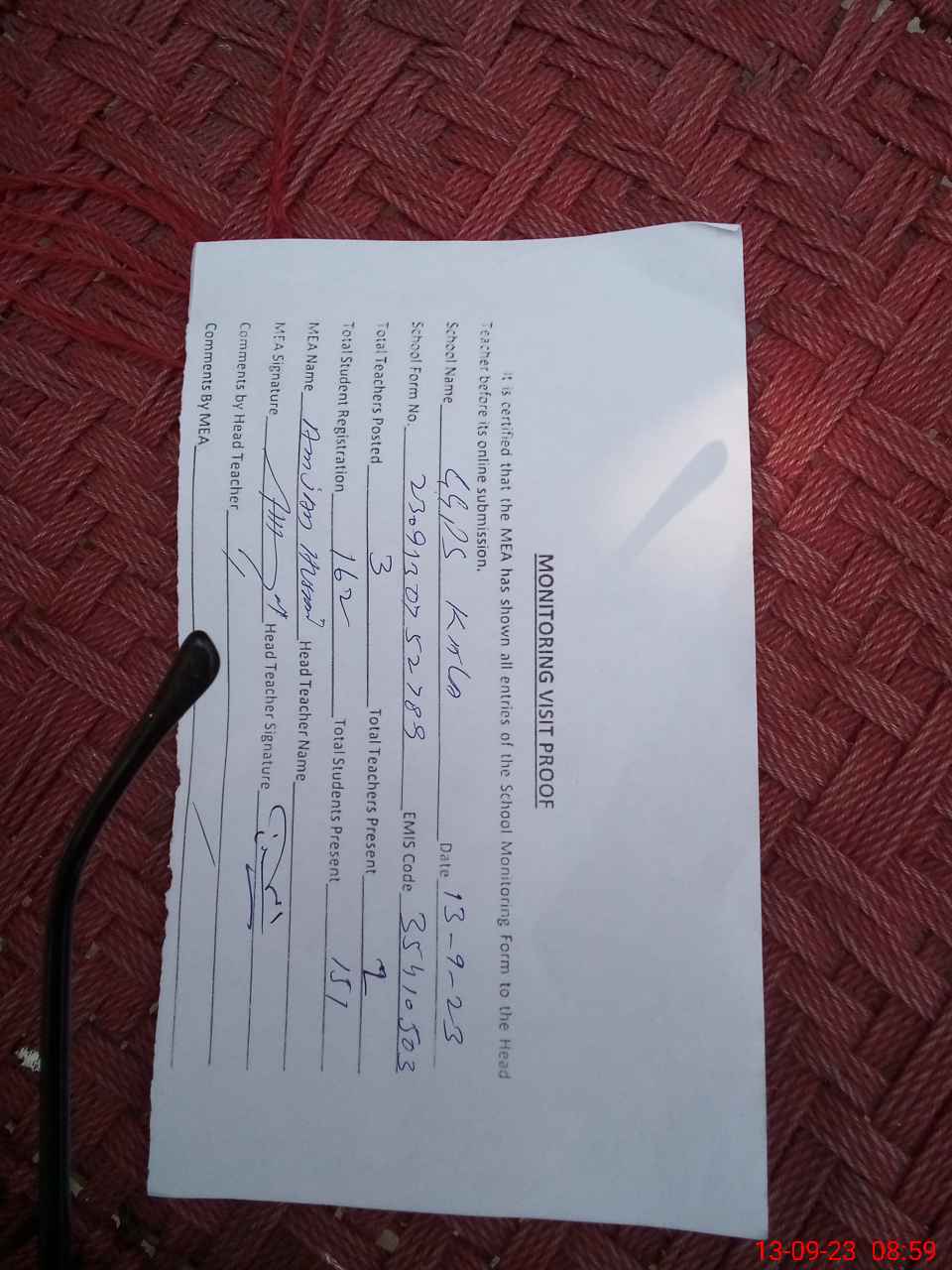| Attendance Register | Head Teacher | MEA with School | Visit Proof |