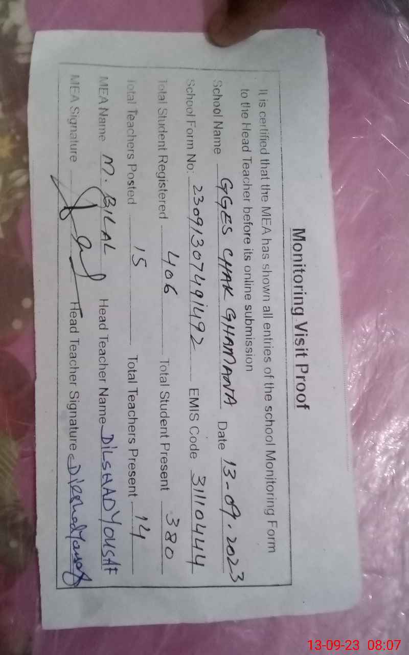 | EMIS Code: 31110444 | Name of School: GGES CHAK GHUMANA | |||