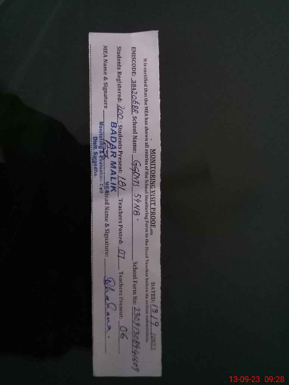 | Attendance Register | Head Teacher | MEA with School | Visit Proof |