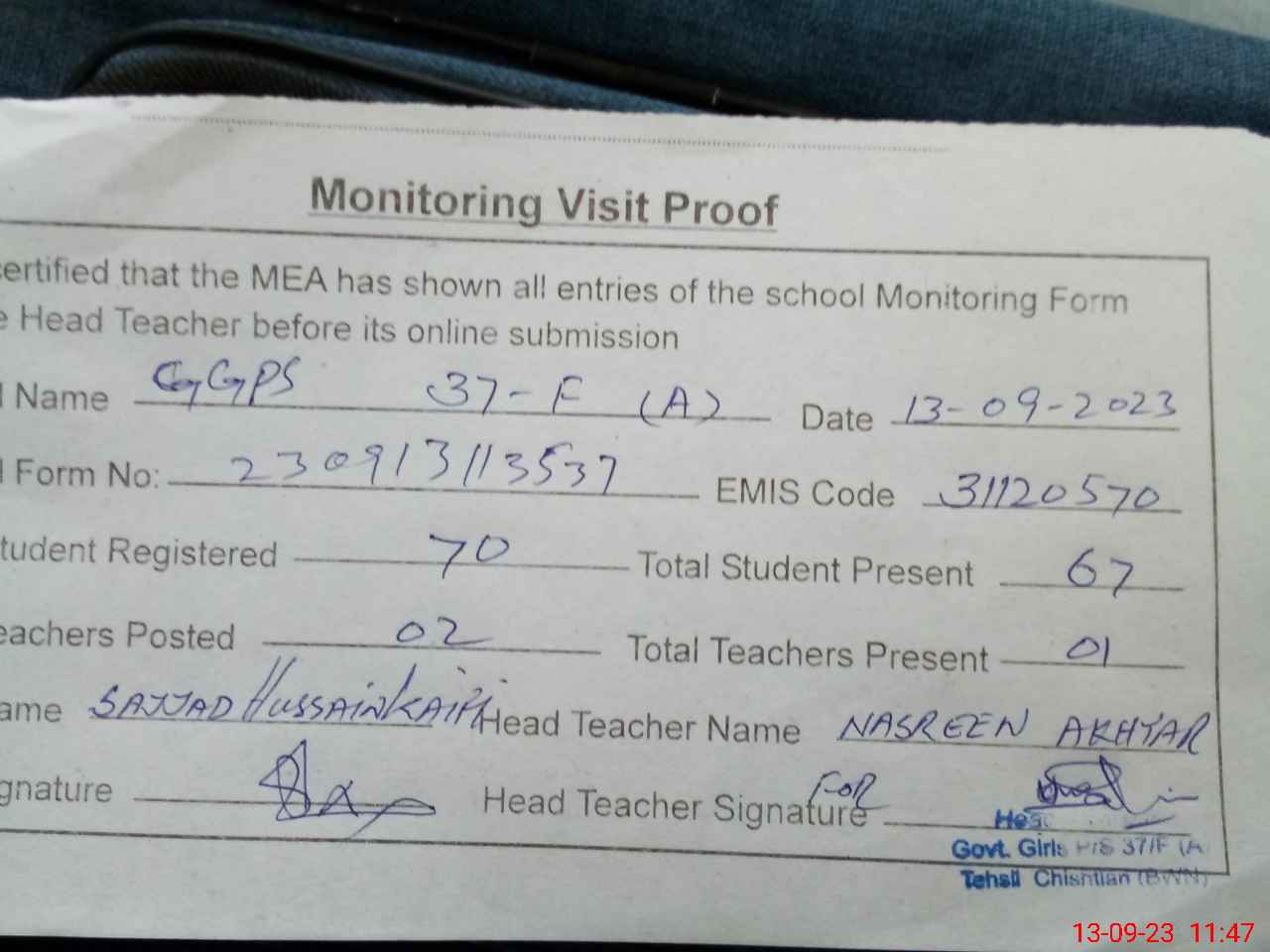 | Attendance Register | Head Teacher | MEA with School | Visit Proof |
