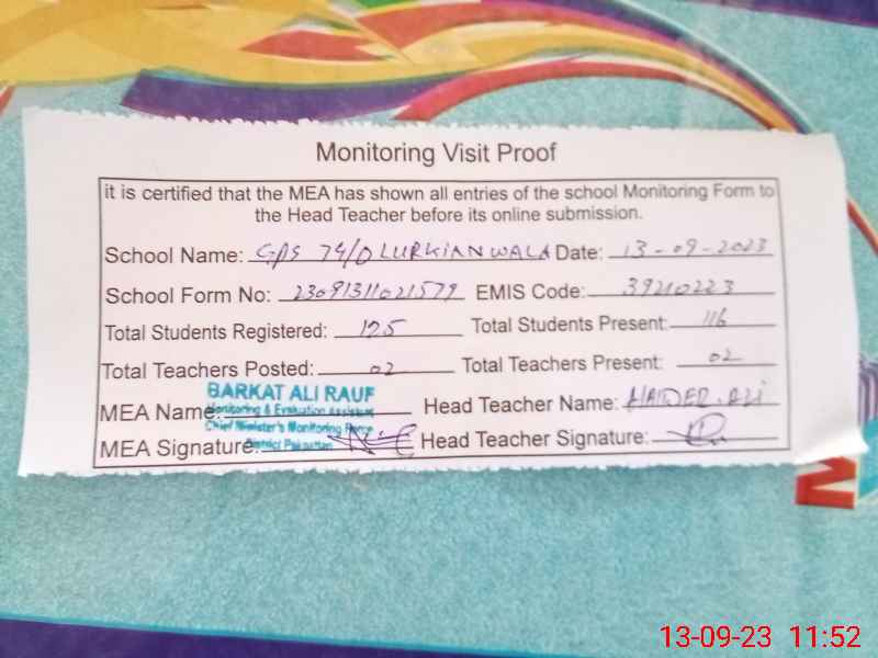 | EMIS Code: 39210223 | Name of School: GPS 74 D LURKIAN WALA | |||
