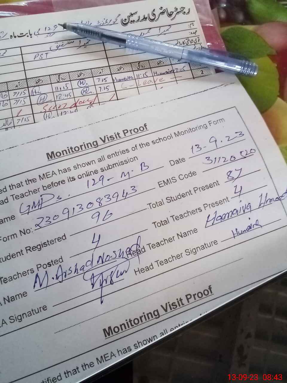 | Attendance Register | Head Teacher | MEA with School | Visit Proof |