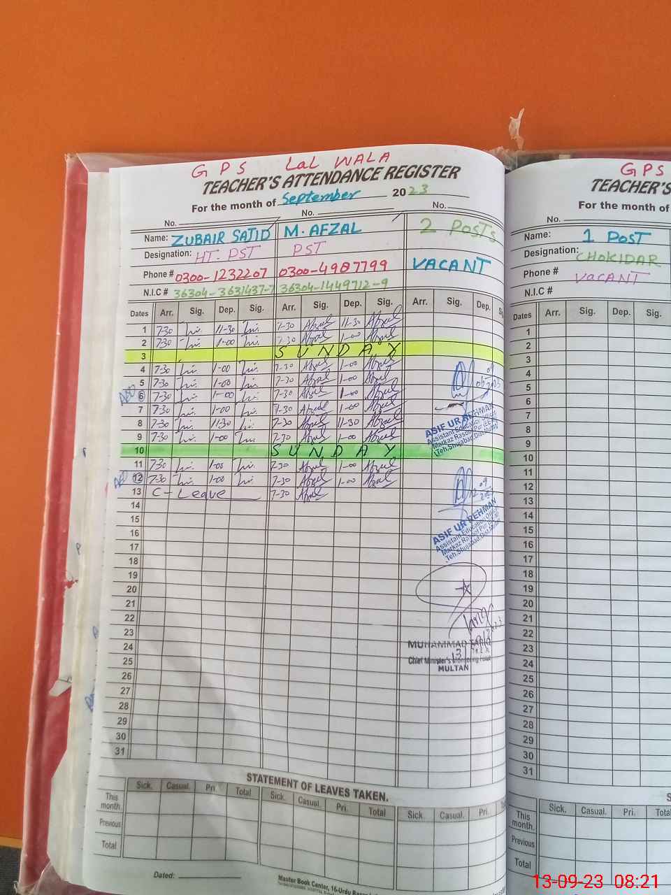 | CNIC | Full Name | Designation | R/C | Absence during last cal. month |