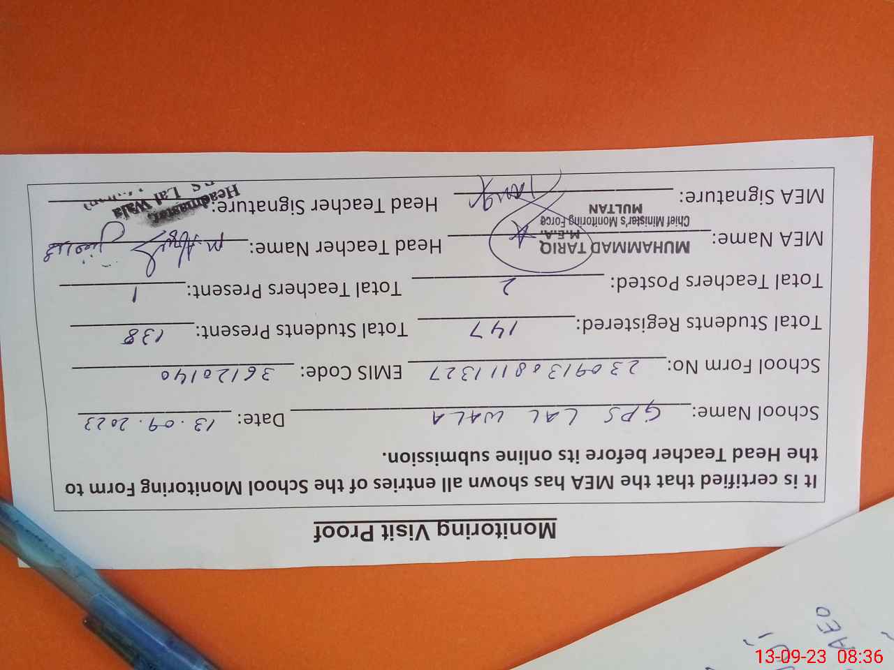 | Attendance Register | Head Teacher | MEA with School | Visit Proof |
