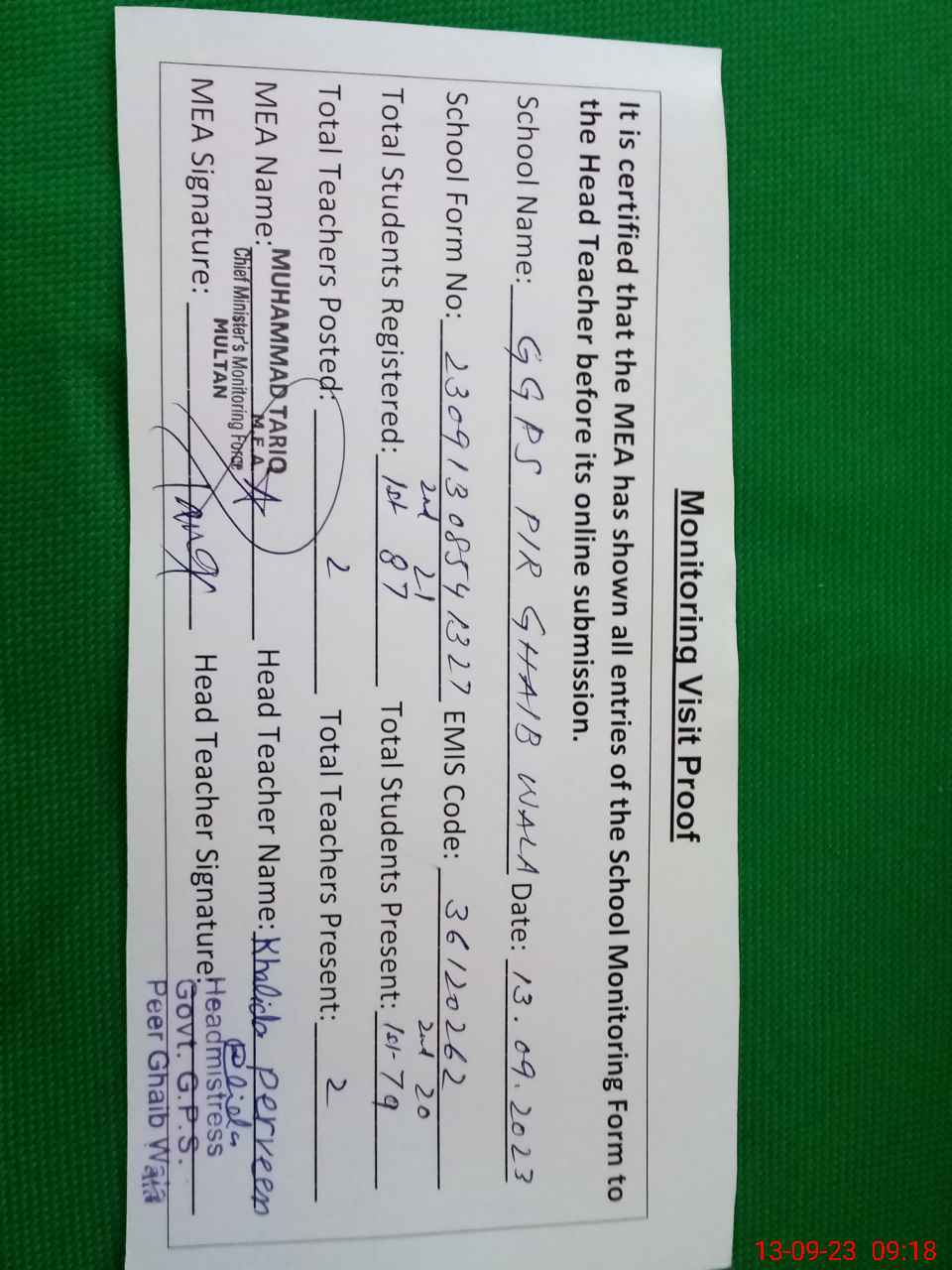 | EMIS Code: 36120262 | Name of School: GGPS PIR GAIB WALA SHUJABAD DISTT. MULTAN | |||