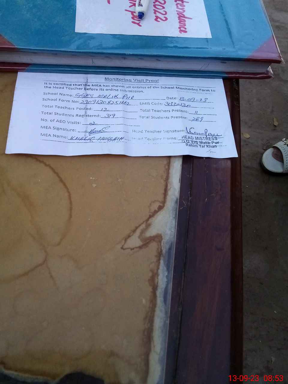 | Attendance Register | Head Teacher | MEA with School | Visit Proof |