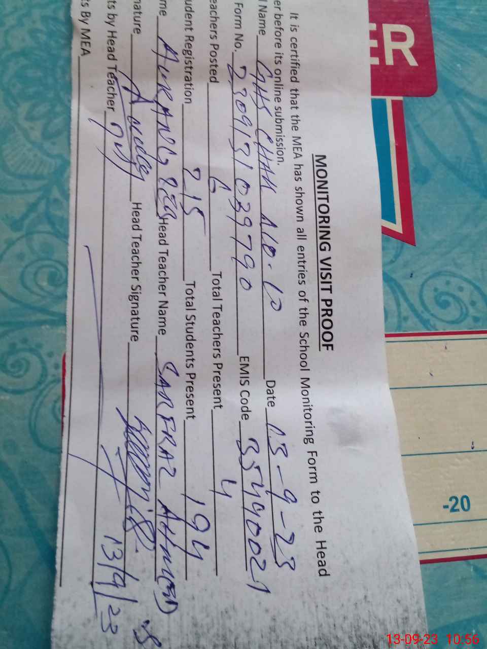 | Attendance Register | Head Teacher | MEA with School | Visit Proof |