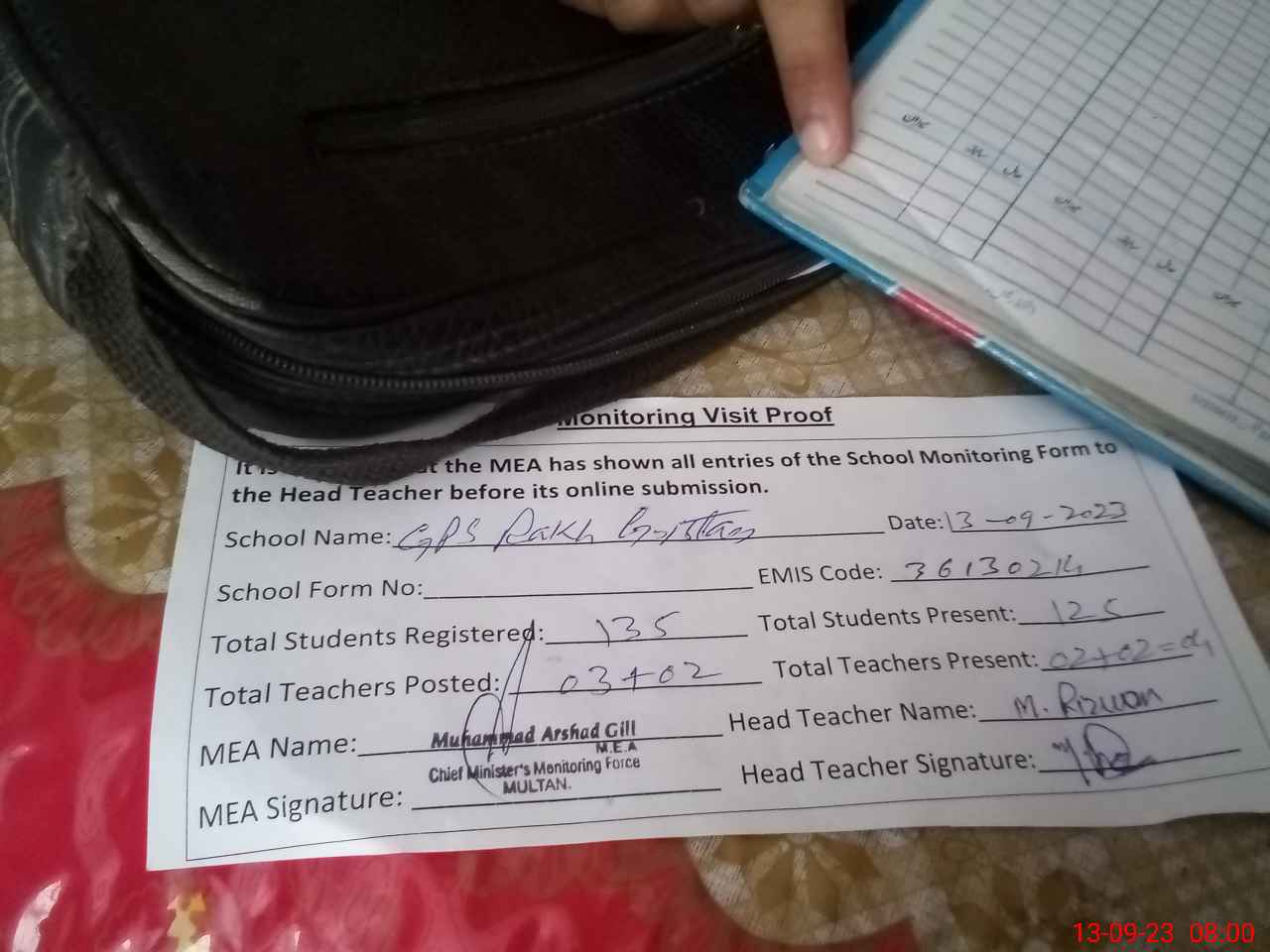 | Attendance Register | Head Teacher | MEA with School | Visit Proof |