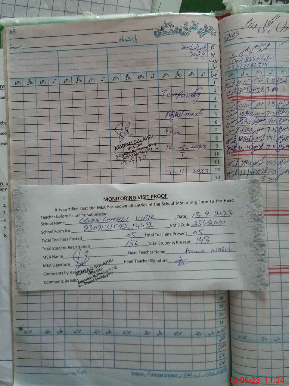 | Attendance Register | Head Teacher | MEA with School | Visit Proof |