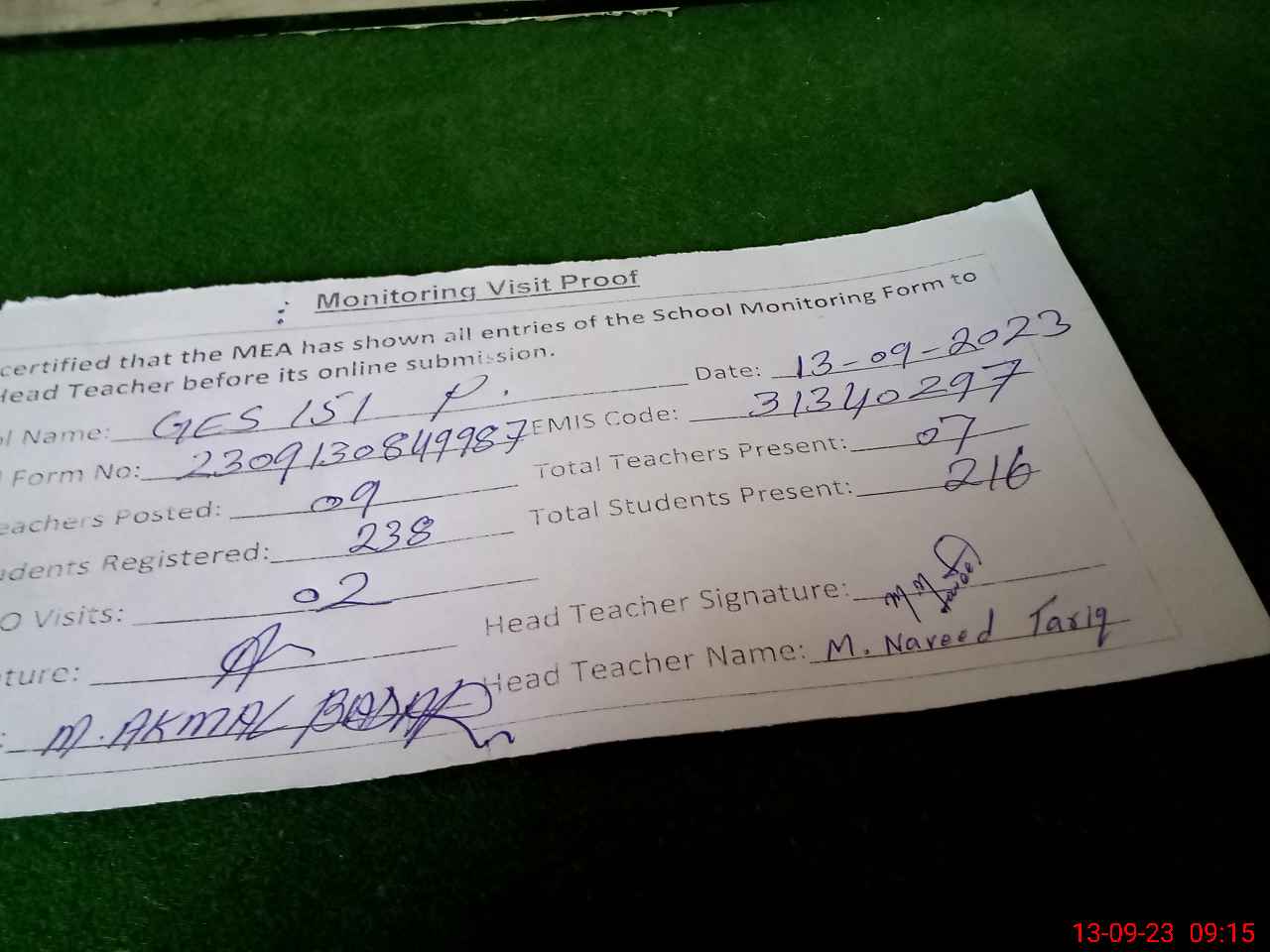 | Monitoring Date: 13-09-2023 | Start Time: 13-09-2023 08:49 AM | End Time: 13-09-2023 09:18 AM | Name of MEA: Mu**** Ak**** Ba**** | |