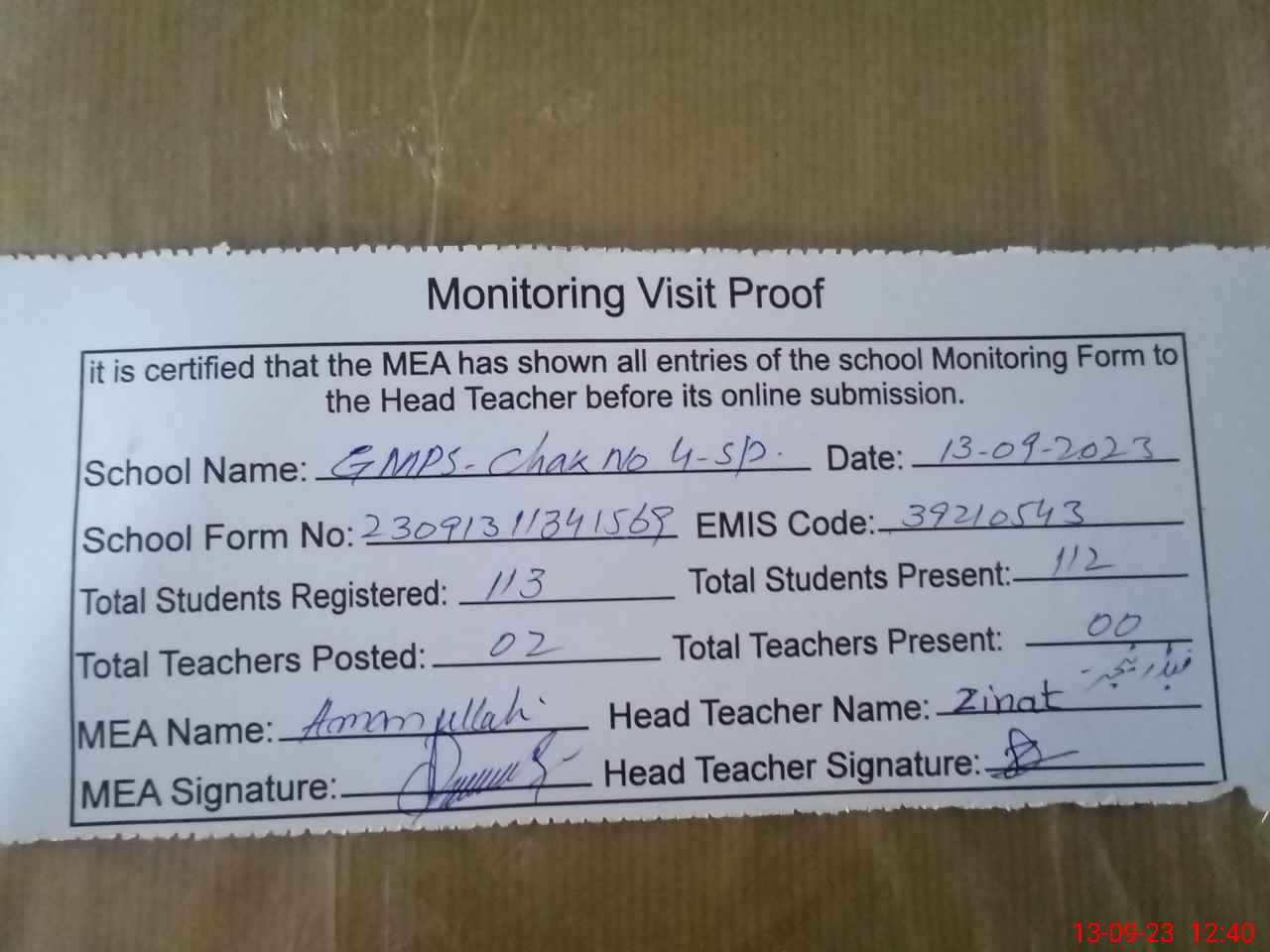 | EMIS Code: 39210543 | Name of School: GMPS CHAK NO. 4/SP | |||
