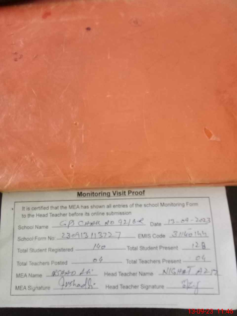 | Attendance Register | Head Teacher | MEA with School | Visit Proof |