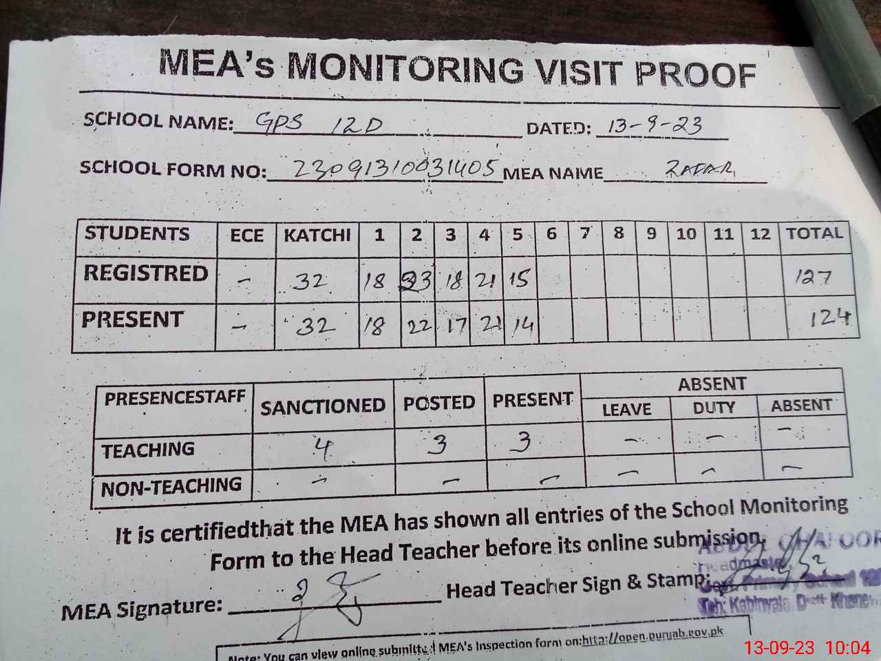 | Attendance Register | Head Teacher | MEA with School | Visit Proof |