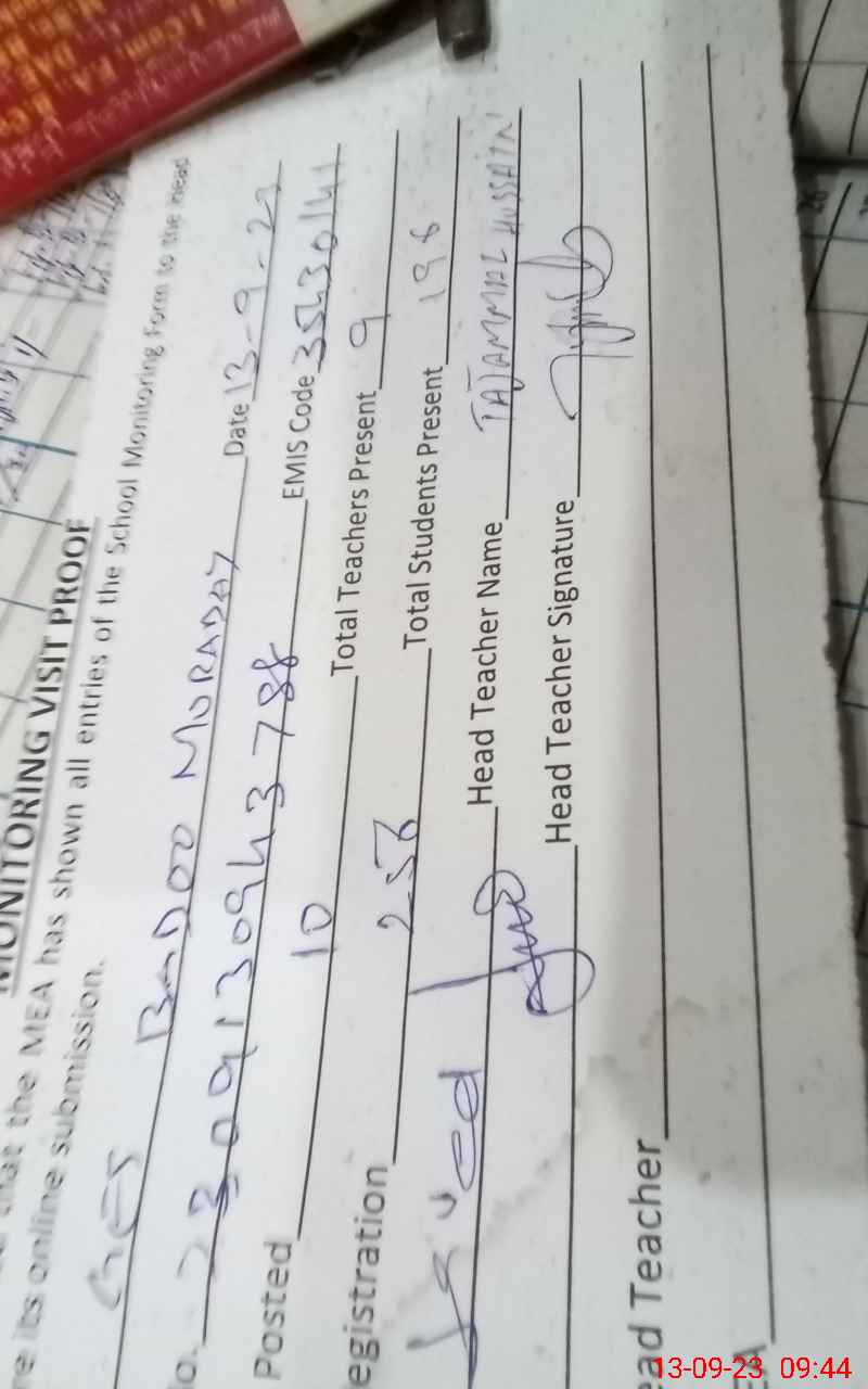 | Attendance Register | Head Teacher | MEA with School | Visit Proof |