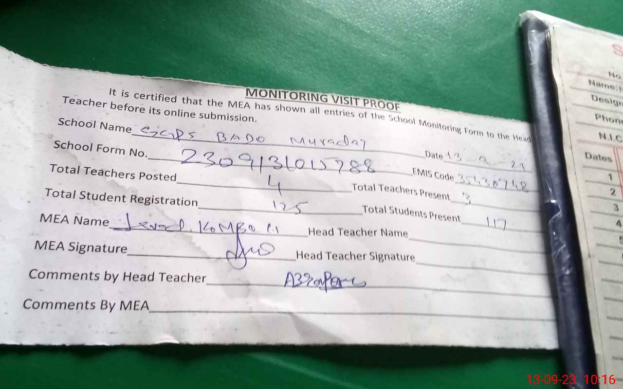 | Attendance Register | Head Teacher | MEA with School | Visit Proof |