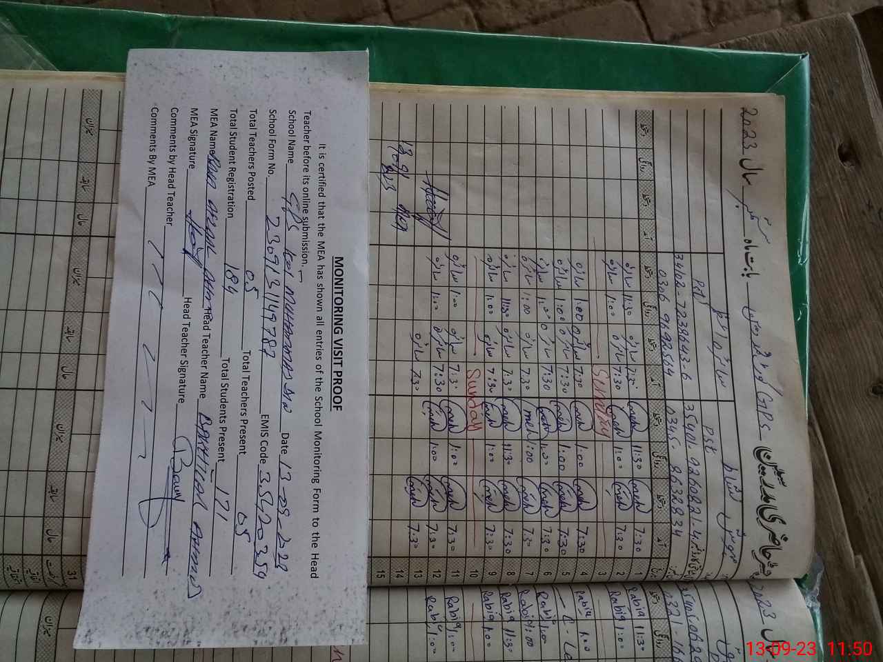 | Attendance Register | Head Teacher | MEA with School | Visit Proof |