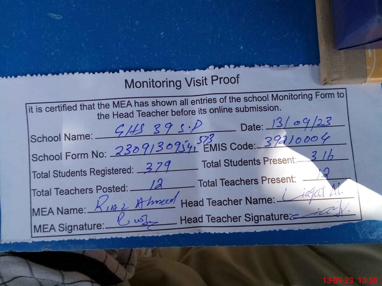 | Attendance Register | Head Teacher | MEA with School | Visit Proof |