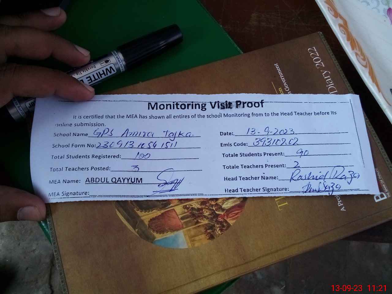 | Attendance Register | Head Teacher | MEA with School | Visit Proof |