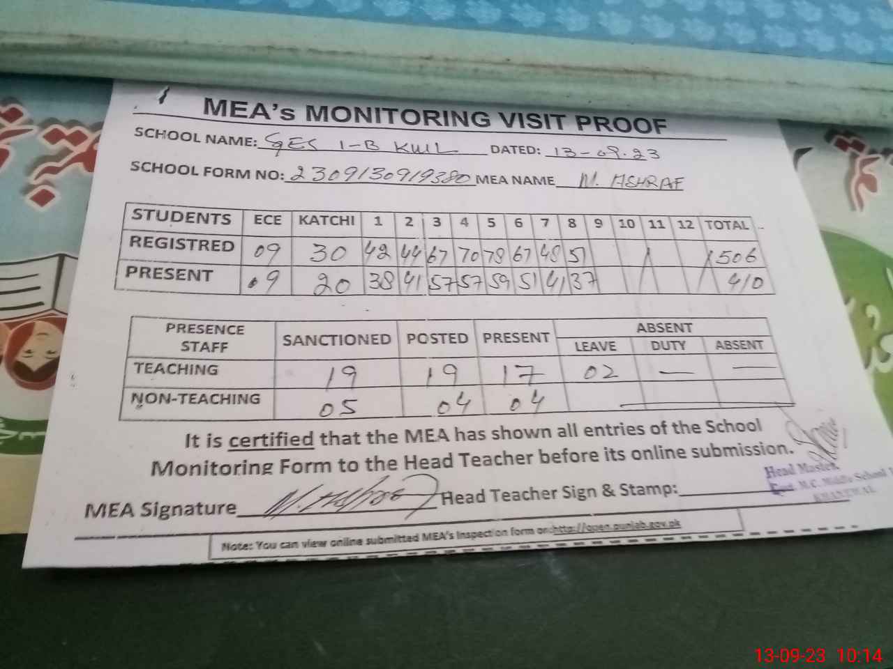 | Attendance Register | Head Teacher | MEA with School | Visit Proof |