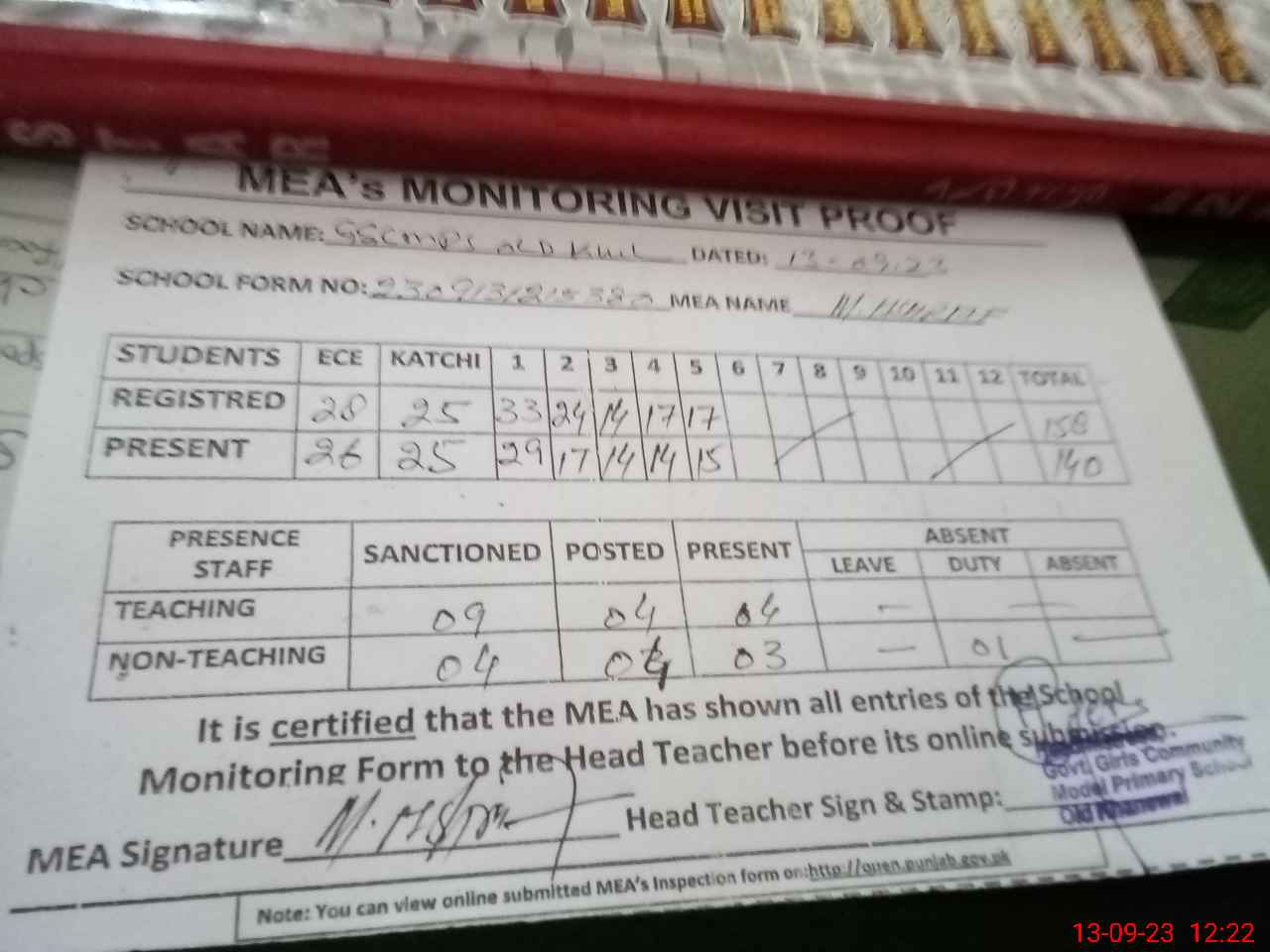 | Attendance Register | Head Teacher | MEA with School | Visit Proof |