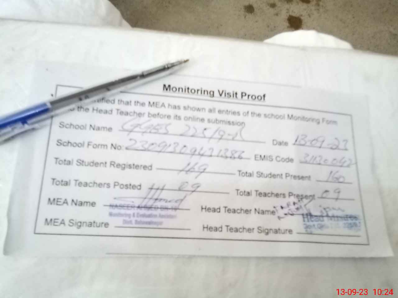 | Attendance Register | Head Teacher | MEA with School | Visit Proof |