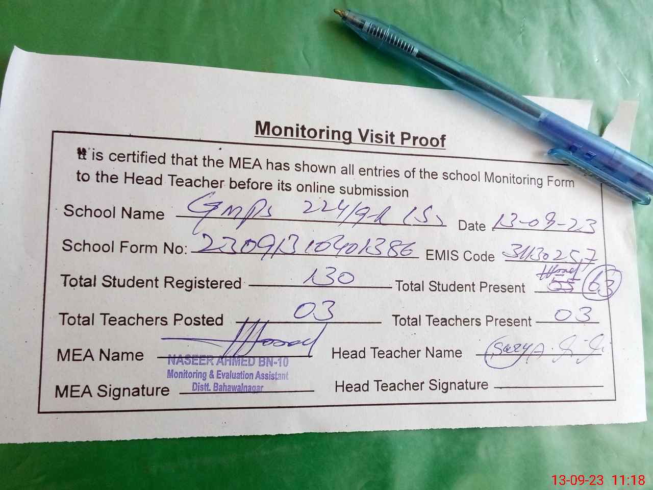 | Attendance Register | Head Teacher | MEA with School | Visit Proof |