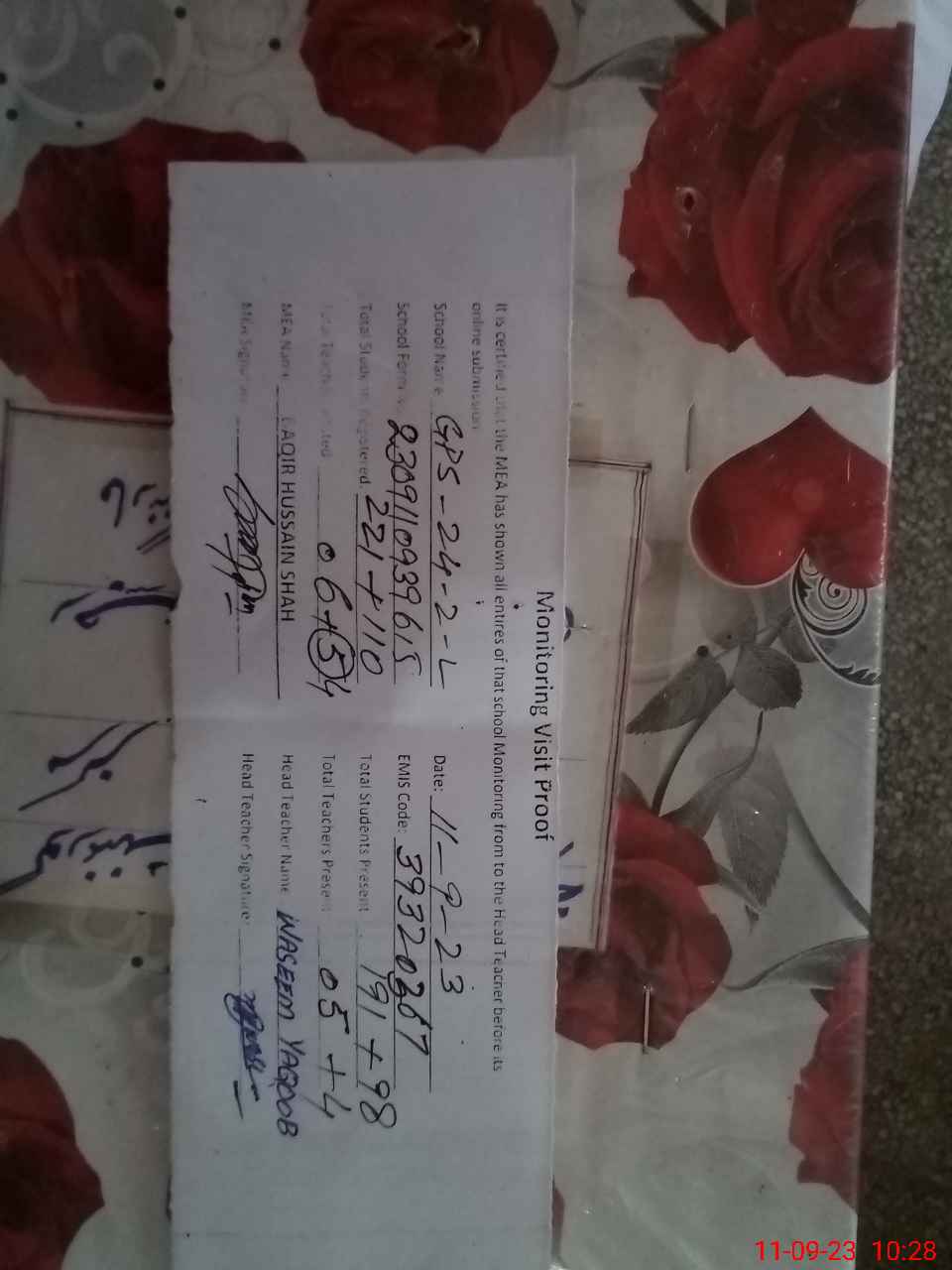 | Attendance Register | Head Teacher | MEA with School | Visit Proof |