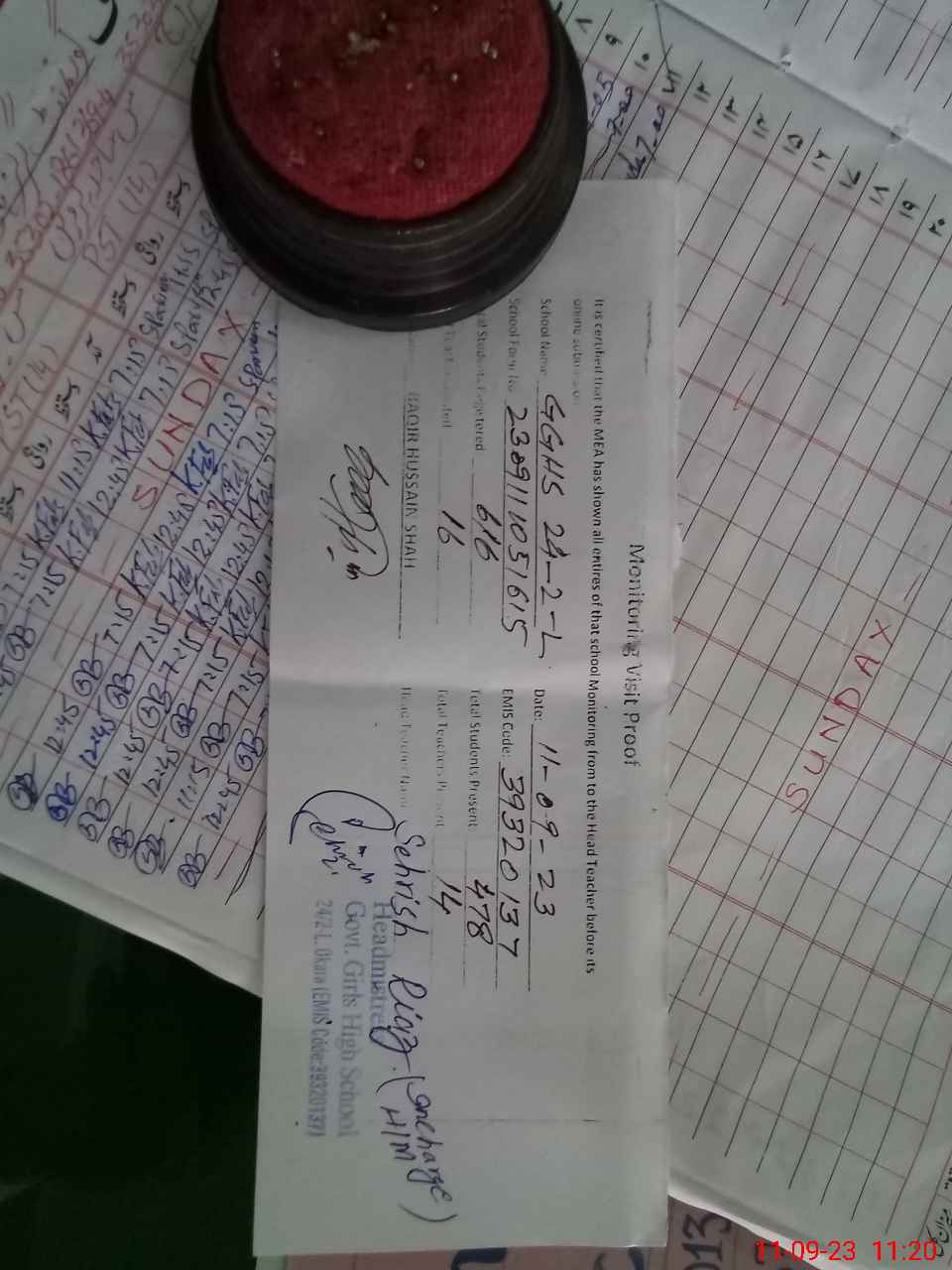 | Attendance Register | Head Teacher | MEA with School | Visit Proof |