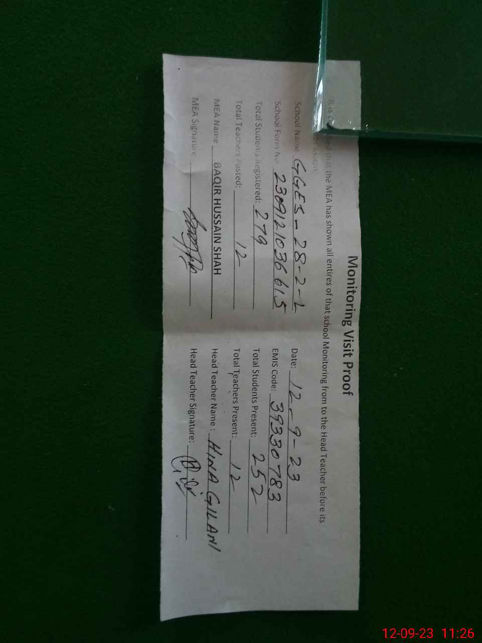 | Attendance Register | Head Teacher | MEA with School | Visit Proof |