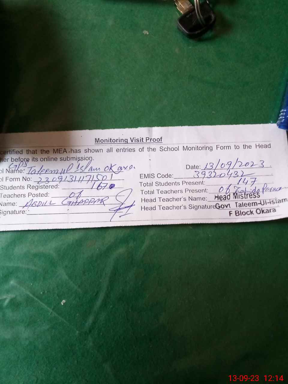 | Attendance Register | Head Teacher | MEA with School | Visit Proof |