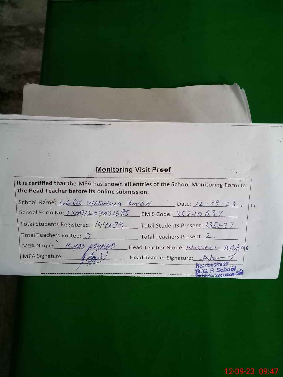 | Attendance Register | Head Teacher | MEA with School | Visit Proof |